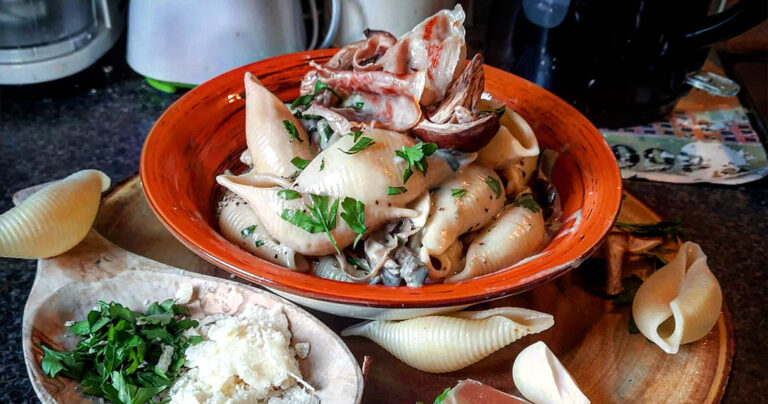 Conchiglie con prosciutto crudo, funghi shitake e salsa di parmigiano from Simple Tasty Healthy by PW Conchiglie con prosciutto crudo, funghi shitake e salsa di parmigiano
