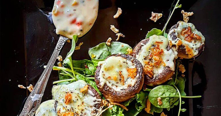 Stuffed Button Mushrooms filled with Blue Cheese topped with Mozzarella, Crispy Onions and Red Pepper from Simple Tasty Healthy by PW Fantastic for a starter or