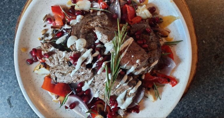 Simple Tasty Healthy by PW A Beautiful Lamb Steak on a Bed of Mixed Grains, Roasted Red Pepper, Pomegranate and a Lemon Yoghurt Dressing with