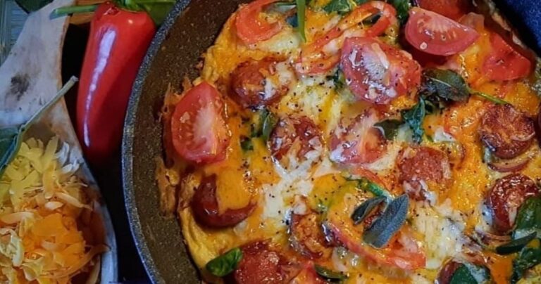 The Cheesy Charleville Omelette Breakfast Recipe The cheesy Charleville Omelette with chorizo, baby spinach, tomato, red onion, red pepper, cherry tomato, Charleville grated cheese and