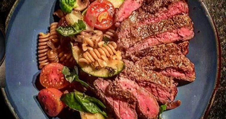 Seared Sirloin Steak with Mediterranean Style Vegetables, Fusilli Pasta and Picked Basil This is a very elegant Sirloin Steak dish and looks beautiful and will