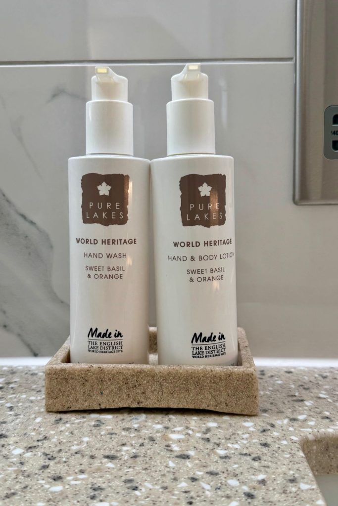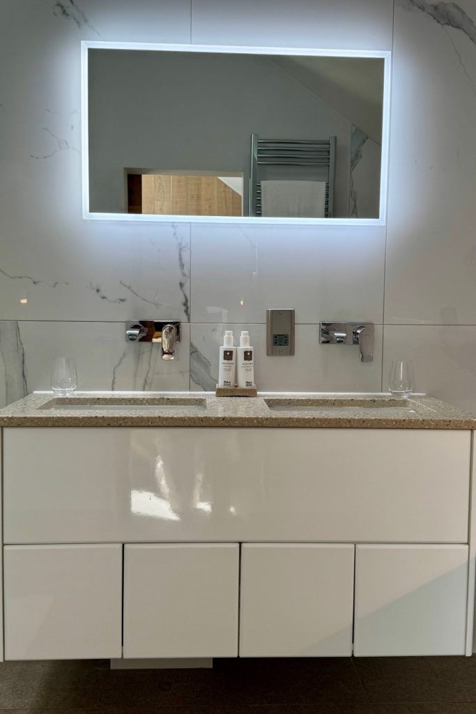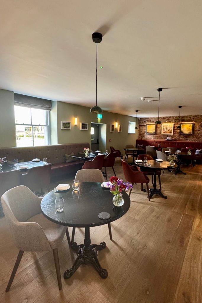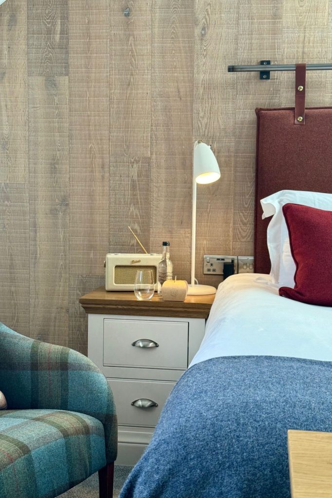 Once checked in, we were shown to our room. One of nine cosy and stylish bedrooms that take inspiration from the “Debatable Lands” of England and Scotland, with room names from Border Reiver clans, infamous for raiding and marauding their neighbours. Our own room was decorated with soft tones, and touches of tartan, wood and slate. In the large bathroom, a super double walk in shower, his and hers vanity unit, the fluffiest of towels and the all-important mirror lighting for applying makeup – if you know, you know!