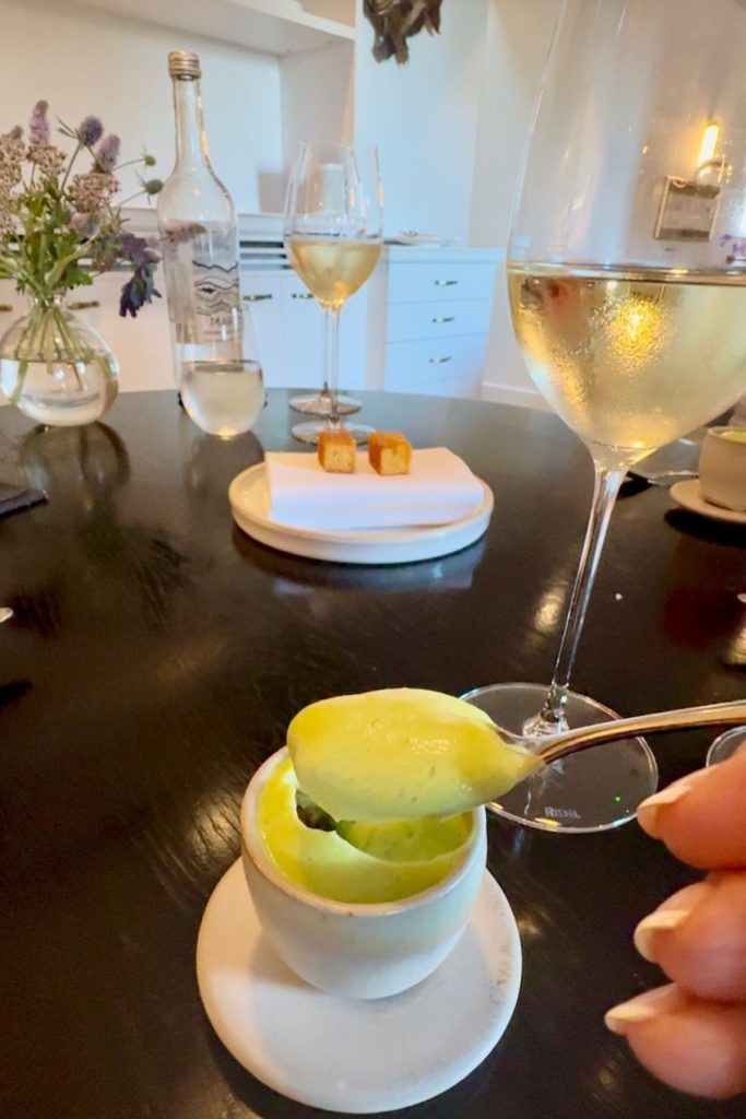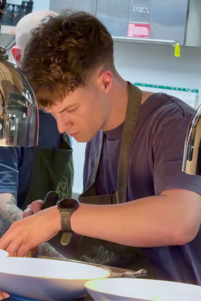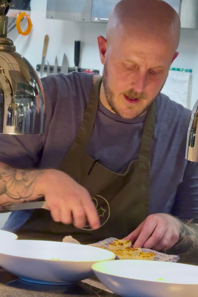 The whole design is open plan and perfect for a fully immersive experience. Close to the bar is a small lounge area with a wood burning stove, this flows seamlessly into the main restaurant area where you will find head chef Chris Archer and his team creating a stunning 8-course tasting menu in an open kitchen.