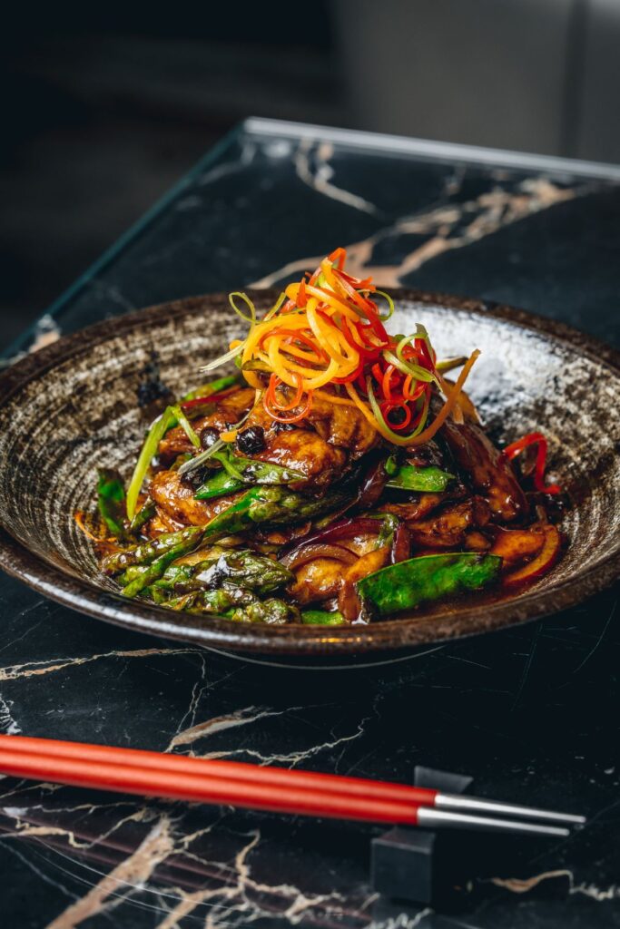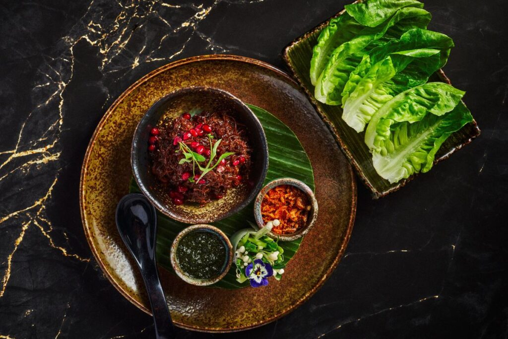 Vegetarian or plant-based diets are not forgotten with offerings such as Special Fried Sweet Potato served in a black vinegar glaze with spring onion and ichimi pepper, Sweet Tamarind Tofu Balls served with watermelon, candied chilli and mint and Beansprout Noodles.