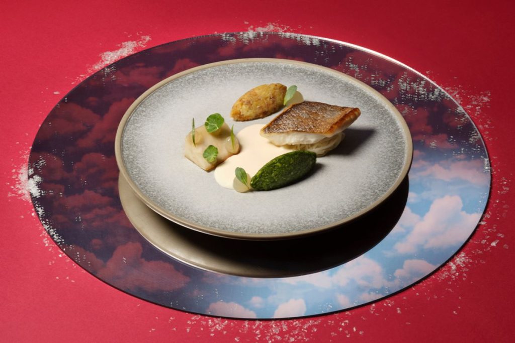 Sea Bass | Ember-Roasted Leek | Burnt Apple | Taramasalata | Dill Pickle Apple