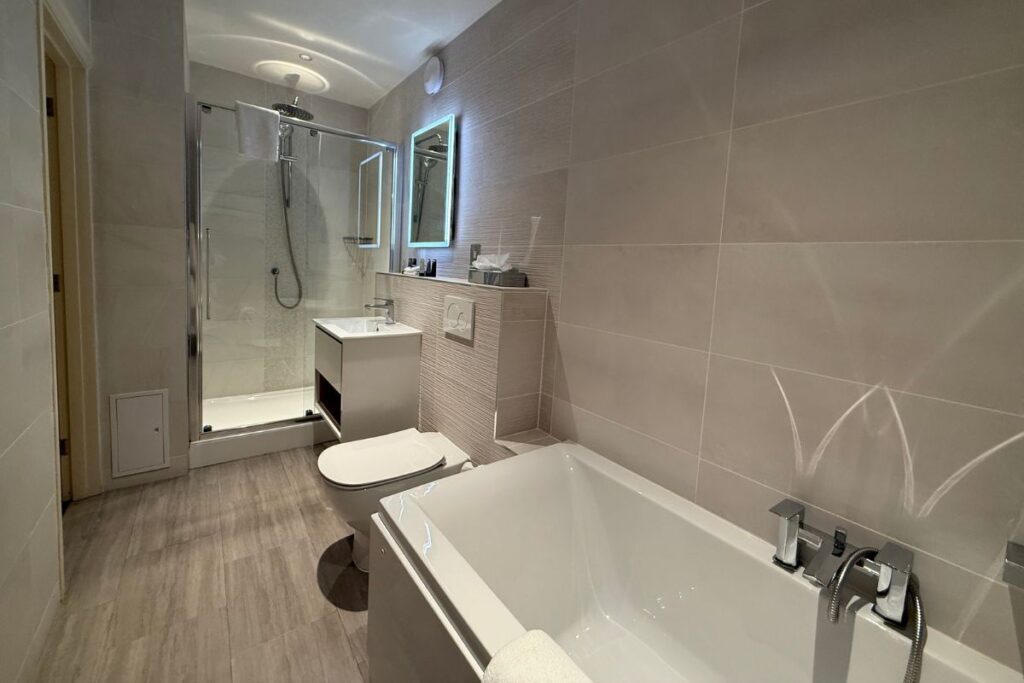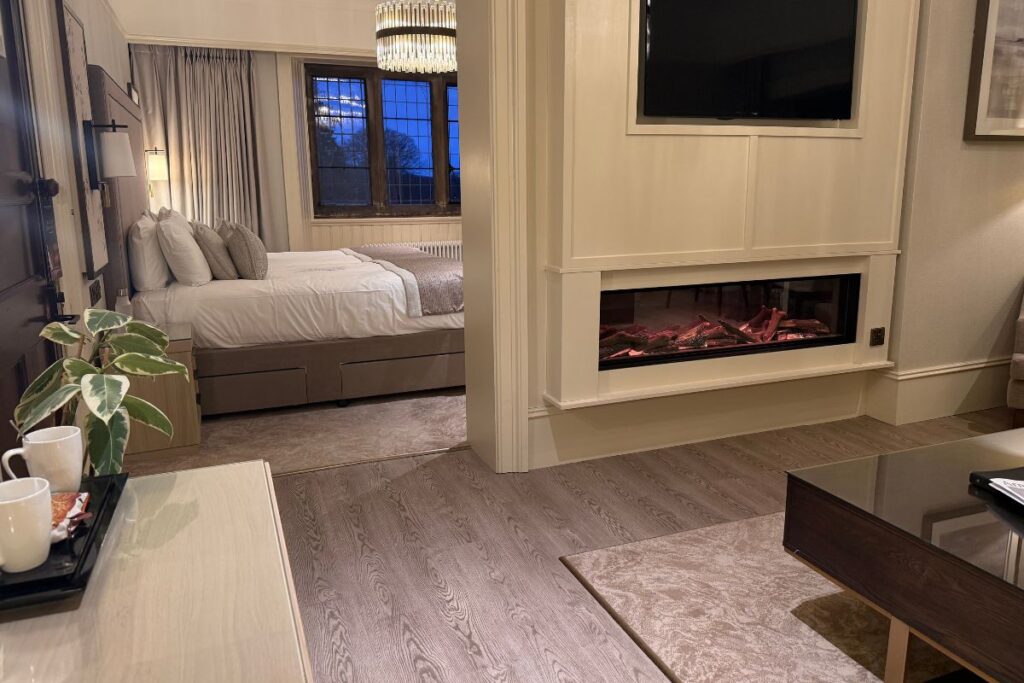 The room did not just look luxurious, it was also deeply comfortable with a serene decor, soft lighting, and a swanky modern fire in the lounge area of the suite. Because of the generously proportioned and beautifully decorated sitting area, rather than feeling like a standard hotel room with a bed as the obvious focal point, our suite felt more like a private retreat within the wider hotel, somewhere you one hundred per cent would want to spend time rather than simply sleep in between dinner and breakfast. This is especially appreciated on a girls’ getaway, where part of the pleasure is in lingering, chatting together, enjoying the space and not feeling hurried.