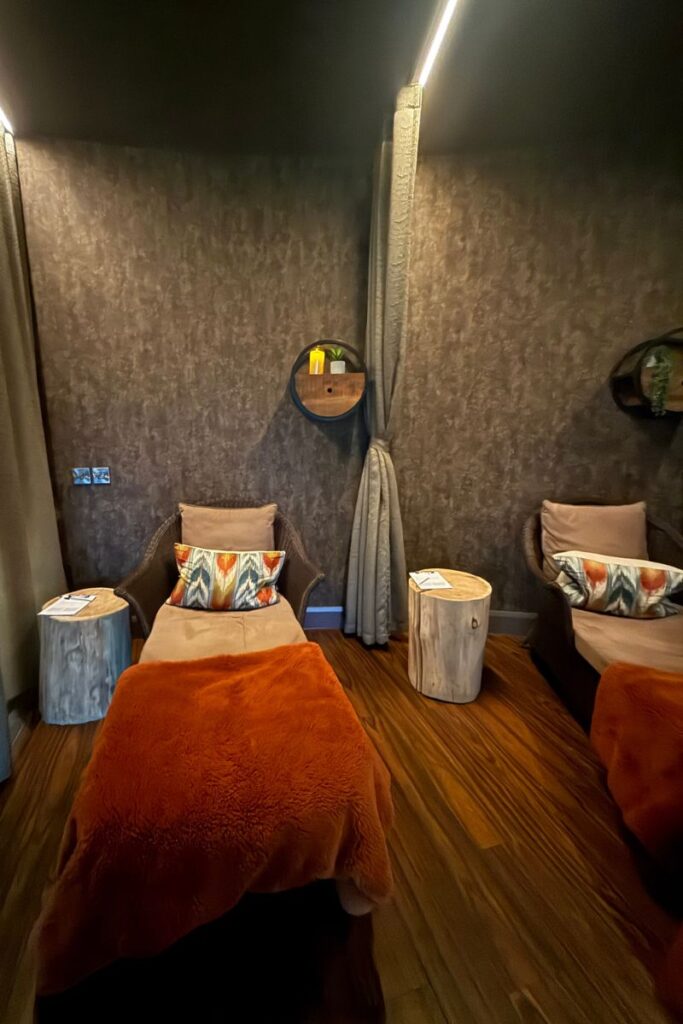 The entrance to the spa treatment area in particular is beautifully done. I filled in my consent form in one of the most aesthetically pleasing lounges I have ever been in, with seating arranged around a central modern (real) fire, mood lighting and relaxation corners, which made the arrival experience feel less procedural and more serene and cocooning from the start.