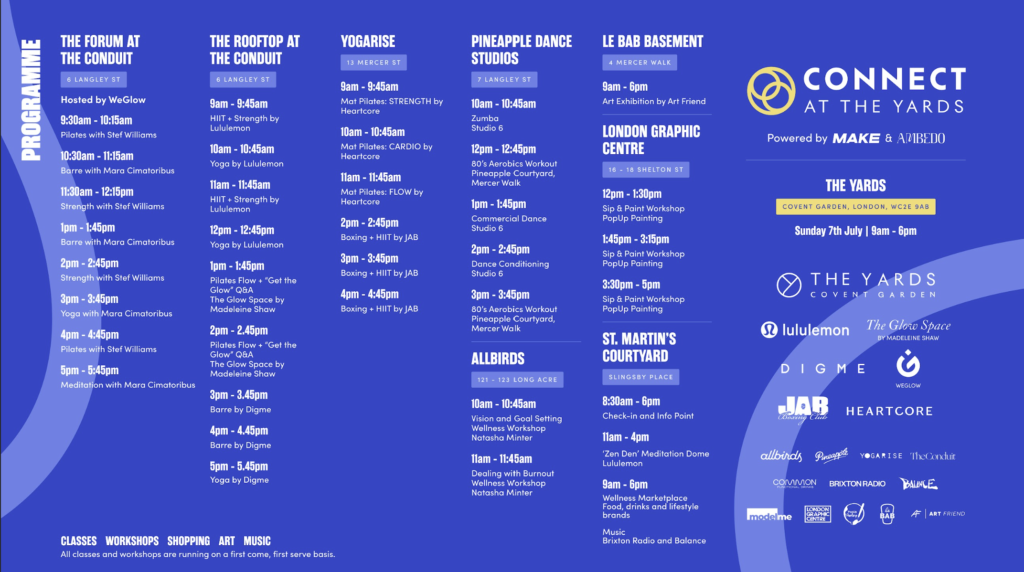 Attendees will enjoy unlimited access to a carefully curated programme of wellness and fitness classes, talks and workshops, art exhibits, live music, and a wellness marketplace, spread across multiple venues within The Yards, all day long.