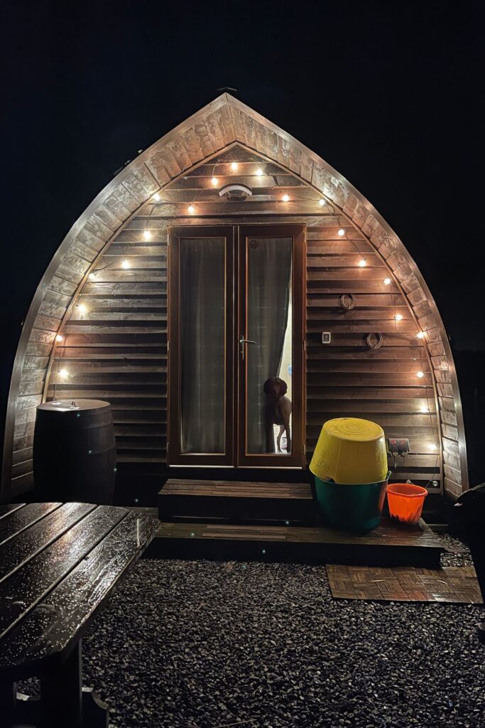 We were booked in a 4-person glamping pod with a wood fired hot tub, which was up to temperature for our arrival. Even for a family of two adults, two teenagers, and two dogs, the pods were surprisingly roomy, with a 4-seater table, double bed, double sofa bed, bathroom and kitchenette. Although this is a glamping experience, you don’t need to pack sleeping bags or bedding, it’s provided on-site.