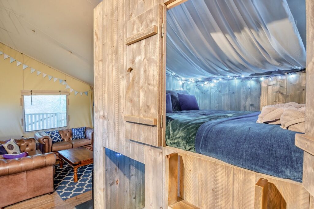 Hidden away in a secluded wooded dell, this enchanting safari tent feels like stepping straight into the pages of The Magic Faraway Tree. Nestled among the towering trees of King Edward VIII Wood, it offers a hidden retreat where families can escape the everyday and let their imaginations roam free. The tent sleeps up to six guests, with cosy spaces for storytelling, outdoor cooking, and evenings gathered around the fire pit beneath a canopy of stars.