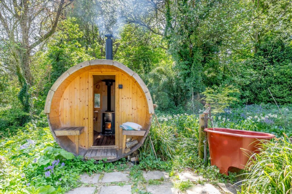 Inside, the open-plan space invites relaxation with a king-size bed, a freestanding bath, and a cosy lounge and kitchen designed for low-impact living without compromising comfort. Step outside to a wood-burning hot tub (available for an extra touch of indulgence) or gather around the fire pit to watch the forest come alive at dusk. Meandering trails through Wendover Woods beckon for peaceful strolls, and the serene setting encourages quiet moments together — the kind of escape that feels like a secret hideaway from a storybook.