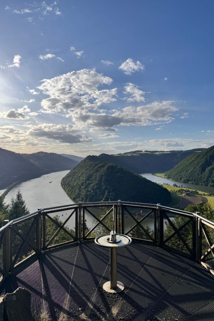 Schlögen is located on the Schlögener Schlinge, the natural loop in Upper Austria’s Danube, and there’s a viewing point high above the trees here for breathtaking views of the plush forests.